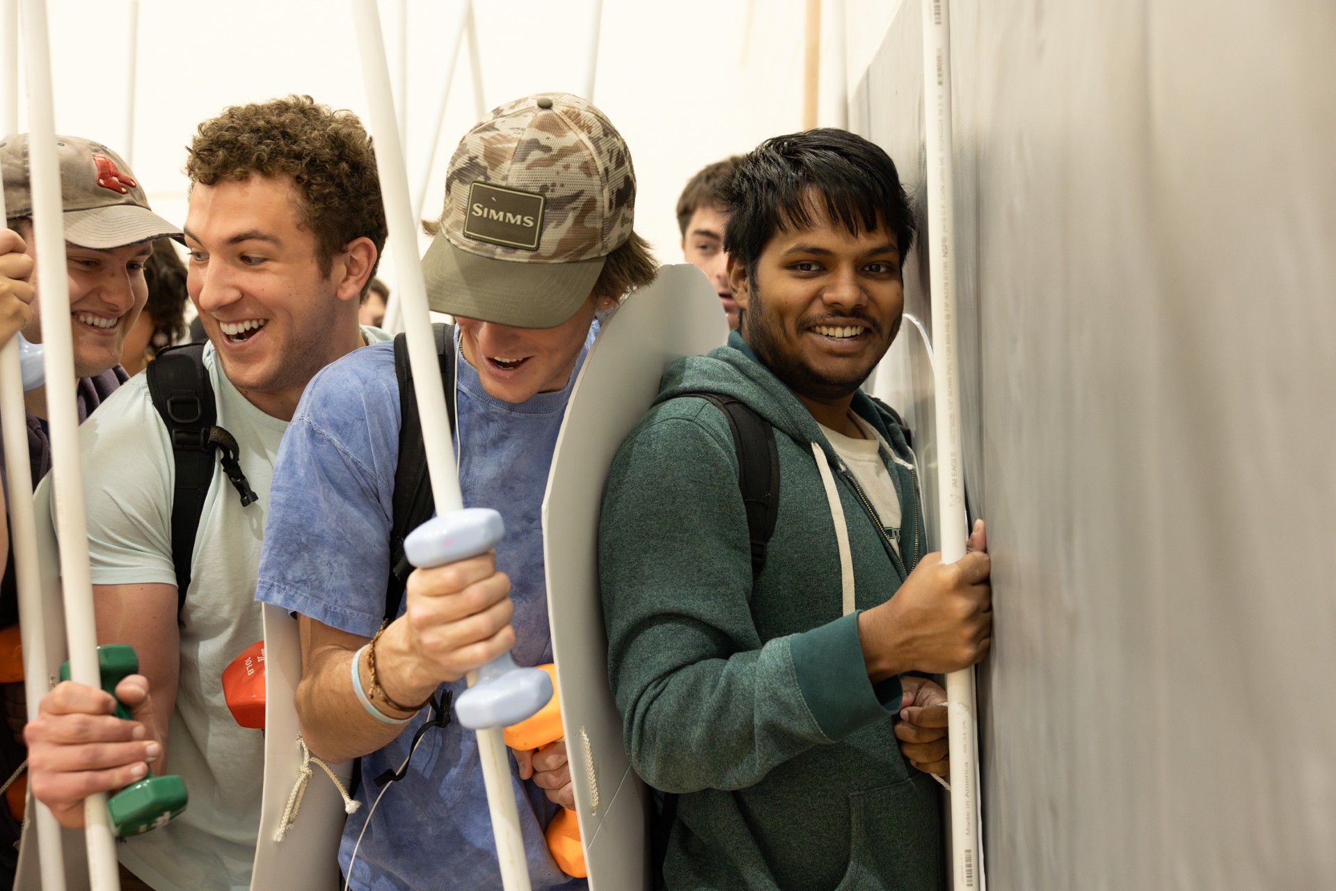 Buxton had students wear one backpack in front and one in back, as well as a helmet. He then supplied them with cardboard silhouettes of a hoplite’s shield and of his weapons, which were cut PVC pipe segments. Students then filled their backpacks, pockets, and hands with dumb bells that accurately simulate the weight of various pieces of gear, including armor, shield, spear, and sword.